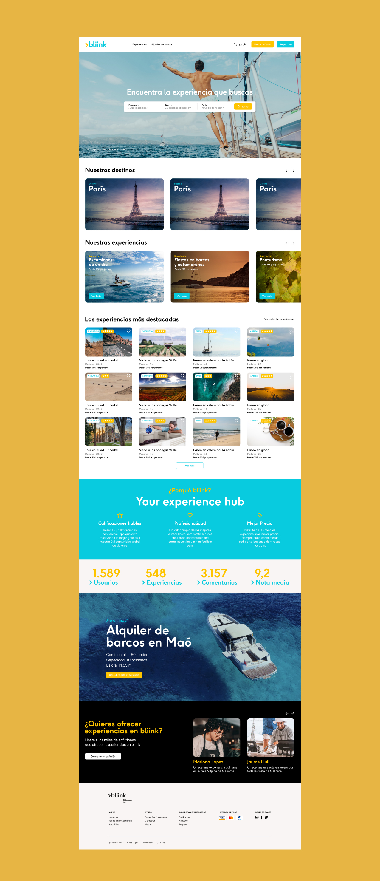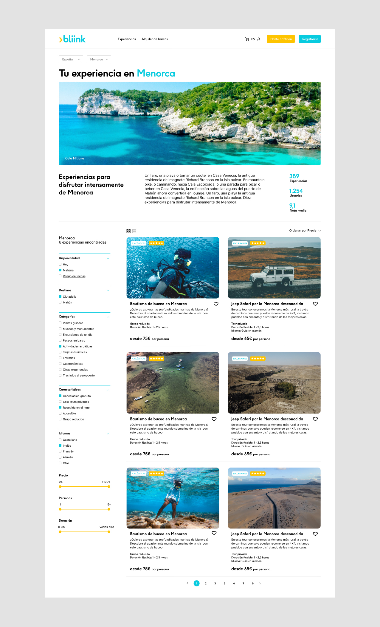 Nos centramos en la funcionalidad y accesibilidad. El mundo de posibilidades que ofrece Bliink es infinito, de modo que debíamos generar una presentación de contenidos funcional, práctica y que facilitara el match entre usuario y experiencia.
